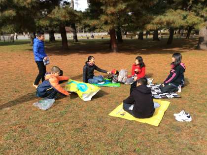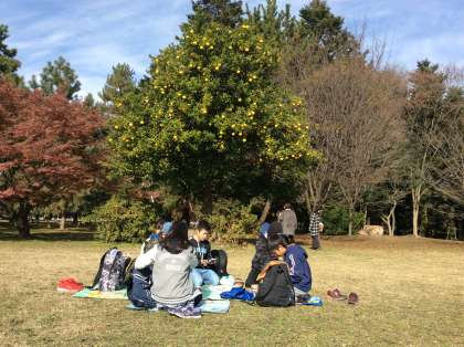 御所にも,昼食をとるグループが集まってきました。あたたかい日差しの下,敷物を敷いて,これからお弁当をいただきます。