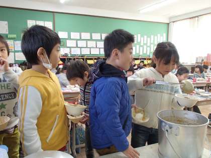 1年生がたくさん食べてくれるので,おかわりを持って来てくださいました。みんな大喜び!次々とおかわりにやってきて,あっという間に食缶が空っぽになってしまいました。