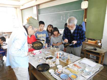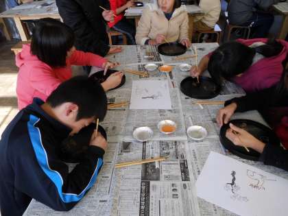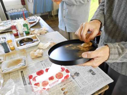 職人の方4名に来ていただいて,ていねいにサポートしていただいたおかげで,それぞれ素敵なお盆ができました。しばらく乾かしたうえで,持ち帰ります。いい思い出ができました。