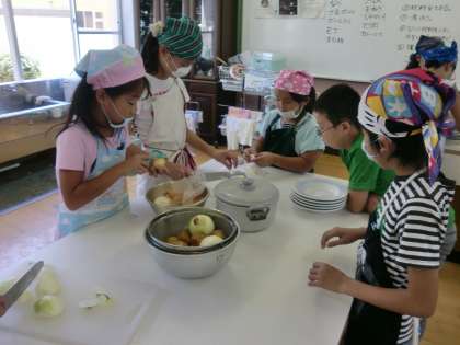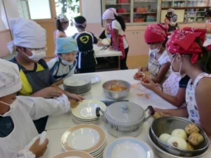 みさきの家に向けて,野外炊事の練習をしました。家庭科室では,材料係がカレーの材料であるにんじんやたまねぎの皮をむいて,程よい大きさに切っていきました。手順を説明すれば,その通りみんなで協力して取り組むことができました。家で料理を手伝っている子も多いのでしょうか,なかなかの包丁さばきを見せてくれる子もいました。