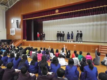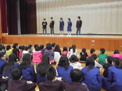 本校の1年生と梅津中学校の1年生との交流が体育館でありました。そりに乗ったサンタさんのいきなりの登場に大喜びの1年生たち。中学生の先輩たちの演出はさすがです。