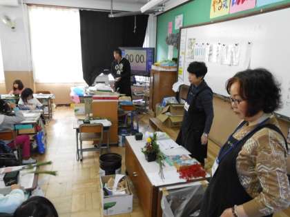 2年生は,ゲストティーチャーの方々をお招きして,生け花体験をしました。今回は「お正月」をテーマに体験をしました。一年を通して日本ではいろいろな行事がありますが,その行事にあったお花の活け方があるそうです。お花を通していろいろなことを教えていただきました。