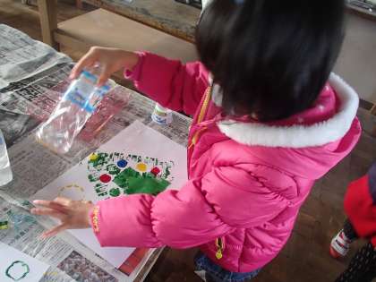 持ってきたものは野菜のきれ,ペットボトル,キャップやプリンカップなど…。洗濯バサミやフォークなどもどのようにして使うのか見ものでしたが,器用に思い思いの表現をしていました。