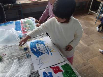 1年生,冬の版画に取り組んでいます。題材は「写した形から」。家庭から持ってきた判を押せるもので,写した形から何に見えるか見立てながら作品に仕上げていきます。