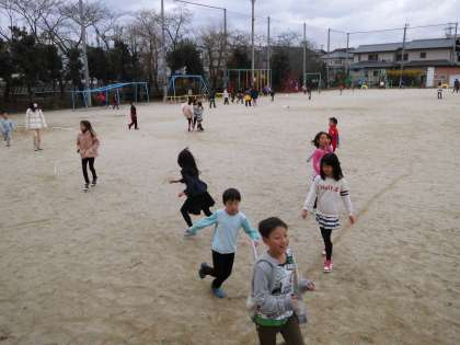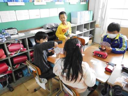 運動場でも,ボール遊びやおにごっこ,だるまさんがころんだなどで仲良く遊んでいました。教室遊びのグループは,トランプでゆっくりと楽しんでいました。