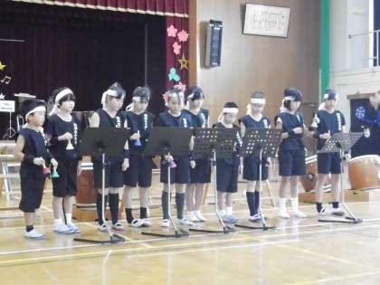 PTAの方々にお世話になり,本校の体育館で開催されました。最初に発表したのは,部活動子ども竹太鼓・器楽クラブ。3年生から6年生のまでのメンバーで息の合った太鼓演奏を披露してくれました。ベル演奏も素敵な音色でした。