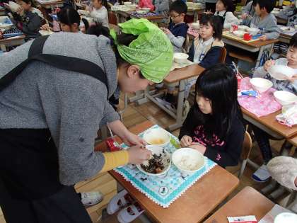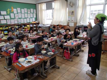 給食を食べていると,1年生の教室に栄養教諭の早田先生が様子を見に来てくれました。歯切れのよい早田先生の言葉かけに,1年生あっという間に引き込まれます。