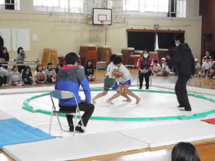 本日1月13日(金)は自由参観です。子どもたちの学校での様子をぜひご覧いただけたらと思います。午前中もたくさんの方に来校いただきました。お昼からもお待ちしています。5・6年生は体育館で相撲大会を開催しています。土俵マットの上での熱い取組,ぜひご覧ください。