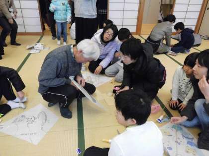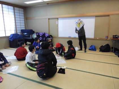 明日の全梅津凧揚げ大会に向けて,みんなで凧作りに取り組みました。少年補導の方々にも教えてもらいながら,それぞれオリジナルの凧が完成しました。