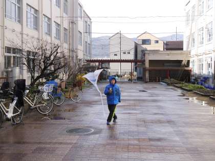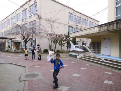 完成すると,早速に中庭に出て上げてみました。明日は誰の凧が高く上がるのでしょうね。児童会や地域の方々作った大凧も上がります。楽しみです。ぜひ桂川河川敷グランドまで足を運んでいただけたらと思います。