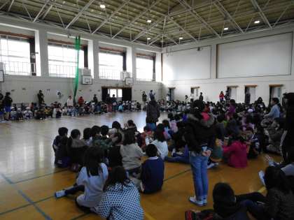 また,冬休み前に算数フェアリーとプリンスから出題された問題の答え合わせもみんなでしました。全校で100名を超える人がチャレンジし,約80名の人が正解でした。正解者の中には1年生もいて,自分の考えたことを全校の前で発表もしてくれました。正解者にはみんなで大きな拍手をおくりました。