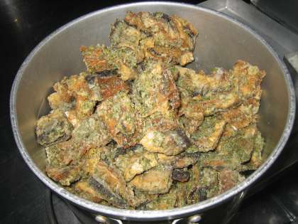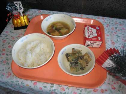 「さんまのいそべあげ」は青のりが入った片栗粉をさんまにまぶし、油でカラッと揚げました。磯の香がして食欲が増しました。