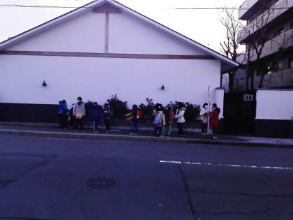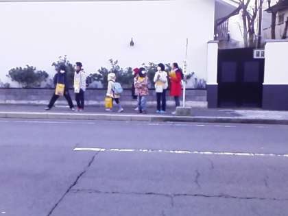 長福寺道から市バスに乗りました。今回は、松尾方面から行く班もあるので、西行きのバス停でも2つの班が待っていました。