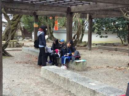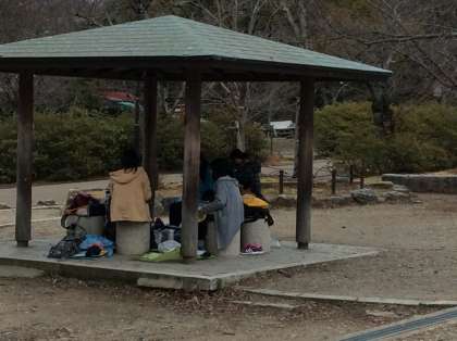 円山公園で昼食を取るグループは時間通り集まり、小雪の降る中ですがお弁当を食べています。