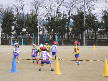 2年生は寒空の下で,ボールけりゲームに取り組んでいます。色のついたビブスを着て,お互いに声をかけ合いながら一生懸命にボールに向かっています。自分のチームがシュートを決めると大喜び。逆に相手チームにシュートを決められると悔しがる。見ていてとても分かりやすいです。