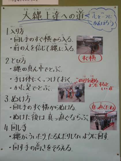 運動委員会で大なわ大会を企画してくれていますが,職員室前に「大なわ上達への道」ということで,うまく跳ぶ方法が写真入りで解説されています。うまくヒントにして,クラスの記録をさらに伸ばしていけるといいですね。