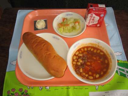「大豆と牛肉のトマト煮」はふっくらとやわらかい大豆とトマトの酸味が味わえました。星型の「ハッピーキャロット」がクラスに一つ入っていました。大盛況でした。
