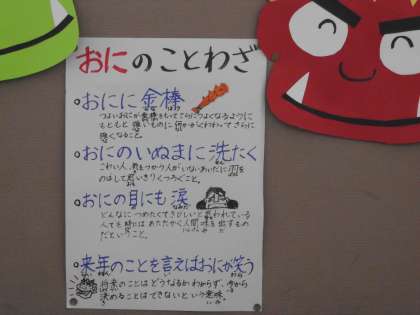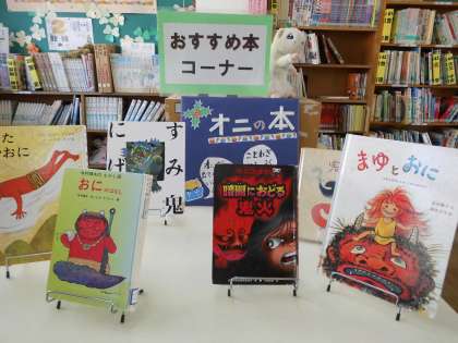 2月になり,節分にちなんだ本,おにの登場する本などが図書館のおすすめコーナーのところに並べられています。また,おにのことわざについても掲示板に紹介しています。
