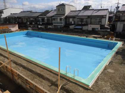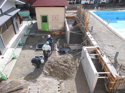 プールの改修工事が毎日進められています。今は,プールサイドやシャワーの部分の工事に入っています。2月14〜15日にかけて,生コン車などの大型の工事車両が入る予定です。引き続きご迷惑をおかけしますが,よろしくお願い致します。