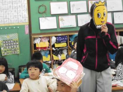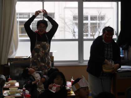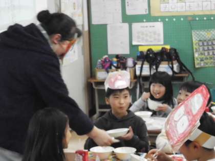 1年1組の教室の次は1年2組の教室です。同じように大歓声。なぜかおにのお面をつけながら給食を食べている人も。先生もおにから豆をいただき大喜びでした。