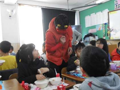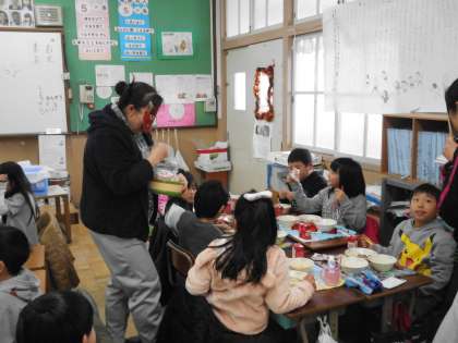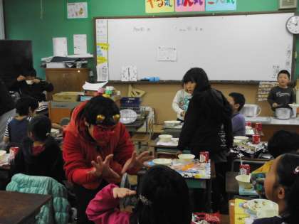「2年生の教室にもおにさん,来てください。」ということで2年生の教室にも豆を届けに行きました。おにに見られているからか,いつも以上にしっかりといただくことができました。