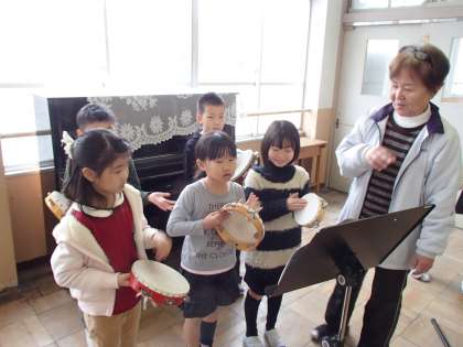 「とんくるりん ぱんくるりん」「こいぬのマーチ」を,それぞれタンバリン・カスタネット・トライアングル・すず・鉄琴・鍵盤ハーモニカのパートに分かれて演奏します。