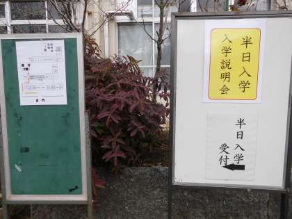 平成29年度の新一年生をお迎えしての半日入学と保護者の方への入学説明会が本日あります。午後1時45分から北校舎1階西端のランチルーム前で受付しています。案内表示に従って来てください。お待ちしています。