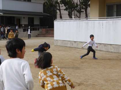 いつも1年生がドッヂボールをしている場所で,今日は1・2年生が一緒になってドッヂボールをしていました。2年生の手加減ないボールにも動じることなく向かっていく1年生たち。なかなかに白熱していました。
