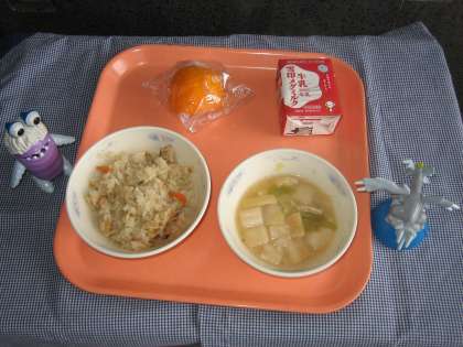 炊きこみ五目ごはん(鶏ごぼう)・牛乳・みそ汁・いよかん