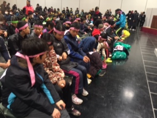みやこっめせで行われた出発式。みんなが見守る中,ステージの上に上がる選手たち。緊張が高まってきているのがよくわかります。