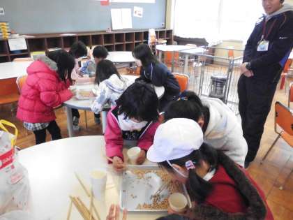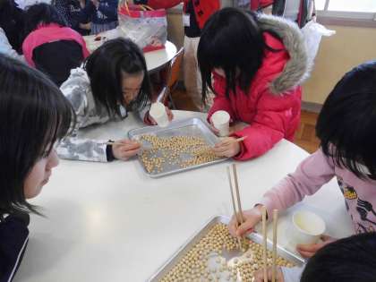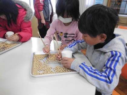 先日の高学年の部に引き続き,低学年の部の豆つかみ大会がありました。1〜3年生のクラス代表が集まりました。1年生と3年生が同点になる白熱した戦いが繰り広げられました。
