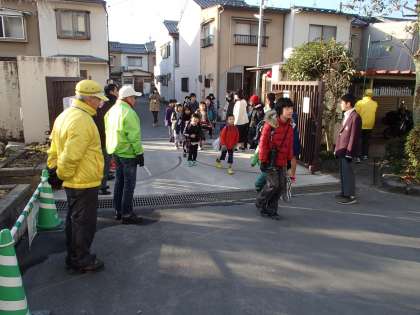 小中そろって気持ちはひとつ,みんな明るい朝を迎えたいと願っています。地域の見守り隊の皆さんや,教職員に見守られて登校です。