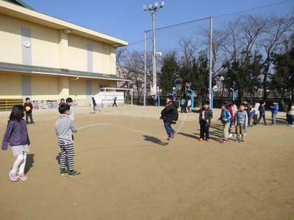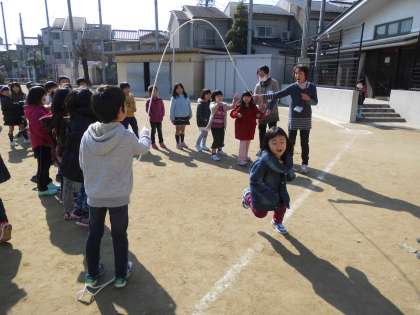 1年生にとっては難しい大なわの8の字跳び。でも,みんなで声をかけ合いながら,一生懸命に跳んでいました。