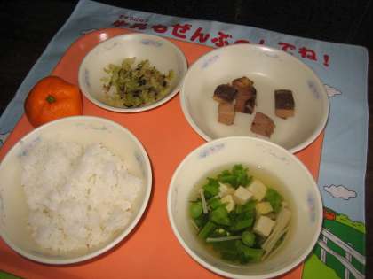 ごはん・なま節のしょうが煮・すぐきのいためもの・花菜のすまし汁・みかん
