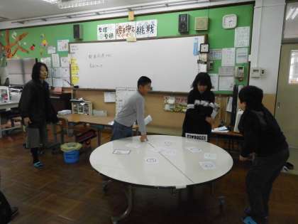 4組では,音訓かるたに取り組みました。自分たちで手作りしたかるたを使って,かるたを読む人とかるたをとる人に分かれて,かるたを楽しみました。