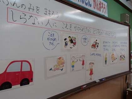今日は今年度最後の参観日でした。学習は学級活動「自分の身を守ろう」。声掛け事案からの被害に,自らの身を守る術を考える学習でした。