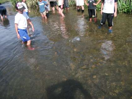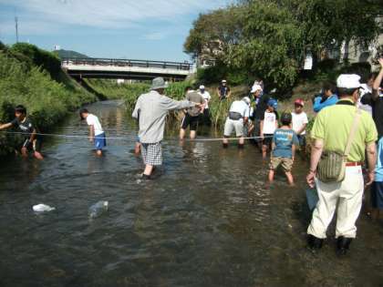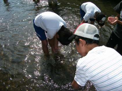 有栖川の水質と生き物調査をしました。まず川幅や川の速さ、におい、深さを測りました。
