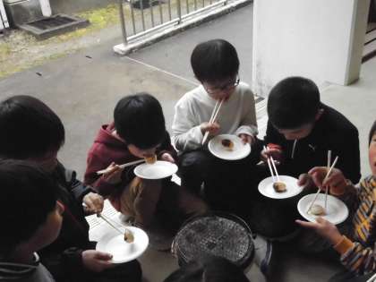 でも,苦労して焼き上げたおもちの味は最高でした。おもちは七輪で焼いて食べるのが一番いいそうです。焼いている間,昔の暮らしぶりについてもいろいろ語ってくれました。本当に貴重な体験をさせていただきました。ありがとうございました。