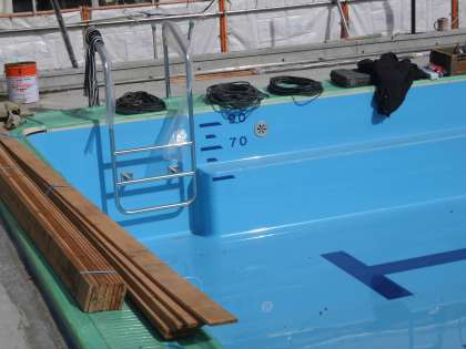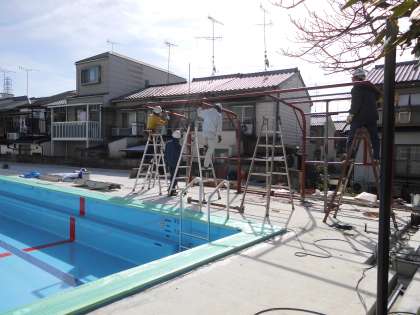 だいぶ出来上がってきました。プールサイドの日よけテントが組み立てられています。プールの壁面には,水深を示す表示もあります。完成が近づいてきています。25日土曜日には,運動場体育倉庫付近にあるプールに水を運ぶ水道管の入れ替え工事が予定されています。まだしばらくご不便をおかけしますが,よろしくお願い致します。
