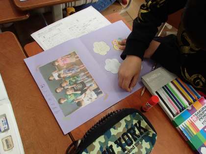 少しずつ出来上がっていくプレゼントのメッセージ集。イラストも描いて,卒業する6年生に,3日の送る会で渡します。