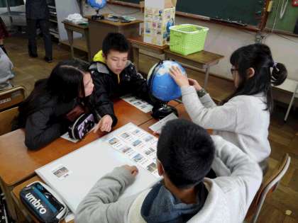 社会科の学習の様子です。地球儀を眺めて世界一周の旅の計画をたてています。