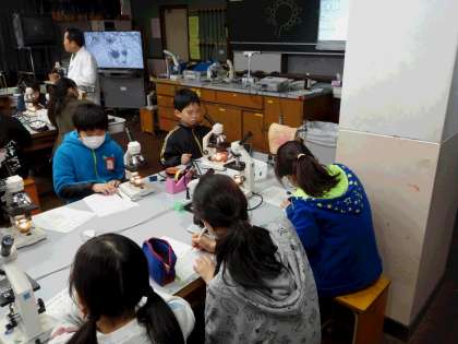 理科の学習の様子です。カビを顕微鏡を使って観察しています。