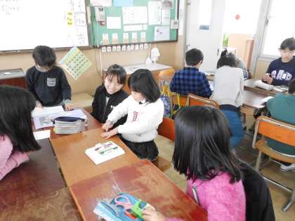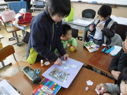 6年生送る会で卒業生にプレゼントするメッセージカードを,たてわりグループで作りました。6年生がいない間に,5年生が中心になって作りました。