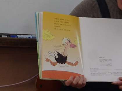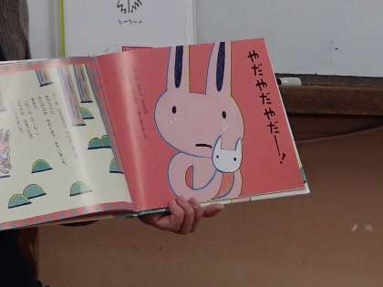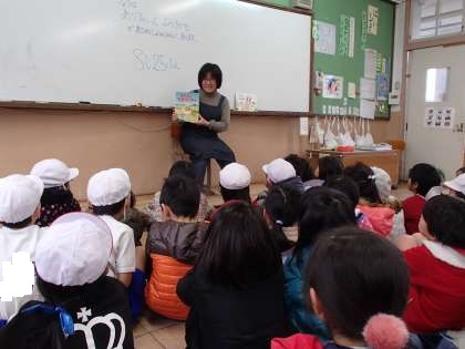 3冊終わったところで,「これで終わりです。」の声に,アンコールが飛びました。実は合計4冊持って来て頂いているのが見えたので,子どもたち楽しみです。アンコールは「おばあちゃんの花」。おばあちゃんに作ってもらったたんぽぽのブーケや首飾り。自分がたんぽぽを好きなのは,もういないおばあちゃんの思い出の花だから,という,ちょっと切なくなるお話でした。