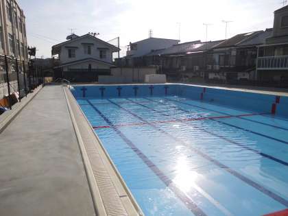 プールに水が張られました。水漏れがないかの確認のために,ほぼ満水にまで水を入れていきます。また,まわりのフェンスなどもこれから設置されていくそうです。