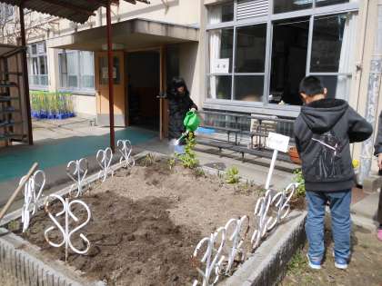 今日は大変寒い日になりましたが,暖かい春に向けてジャガイモのタネイモを植えました。今年の春先,ジャガイモの葉を使って理科の実験をしたこと,そして,じゃがバターなど調理をしておいしくいただいたことを覚えていて,また来年度も同じように育つといいなという願いも込めて植えました。また引き続きお世話を頑張っていかないといけませんね。