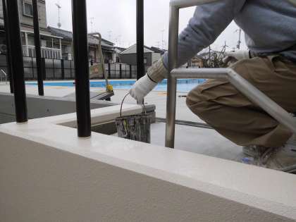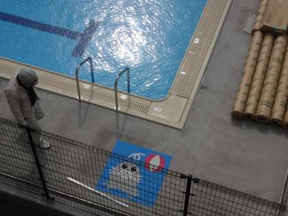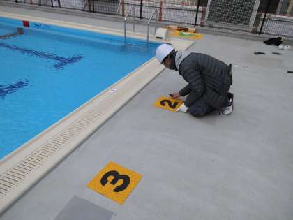 日々,少しずつ工事が進められています。今日はプールサイドにイラストやコース番号が貼られていきました。また,ペンキをきれいに塗り進めてくれてもいました。