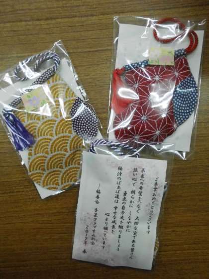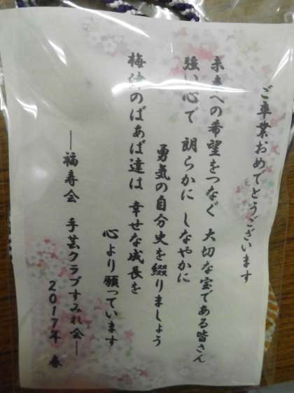 6年生の卒業を祝って,地域の老人会の方々からプレゼントをいただきました。一人一人に手作りのキーホルダーが手渡され,みんな驚いていました。毎年,プレゼントをいただいているようで,うれしいかぎりです。本当にありがとうございます。