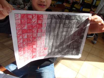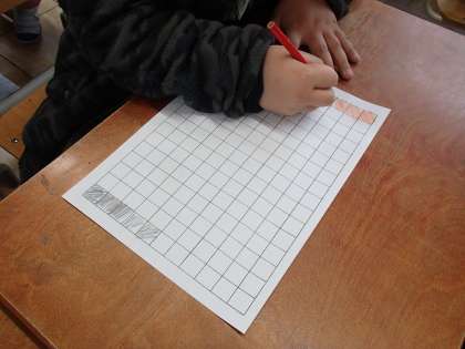 算数科「おおきさくらべ(ひろさ)」では,シートを重ねるところから,マスを塗り分けて比べるところに入りました。じゃんけんで勝ったらひとつマスを塗って,どっちが広く塗れたかを,遊びを通して考えます。教科書のものよりもだいぶマスの多いシートを使ったのですが,決着を着けるまで100回以上じゃんけんを繰り返したペアも出始めました。とにかく熱中するものにはとことん熱中する1年生,見ていてすがすがしいほどです。