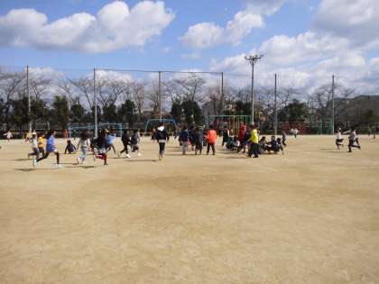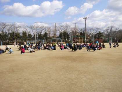 中間休みにシェイクアウト訓練を行いました。運動場の子どもたちは、真ん中に集まり静かに待つ練習をしました。